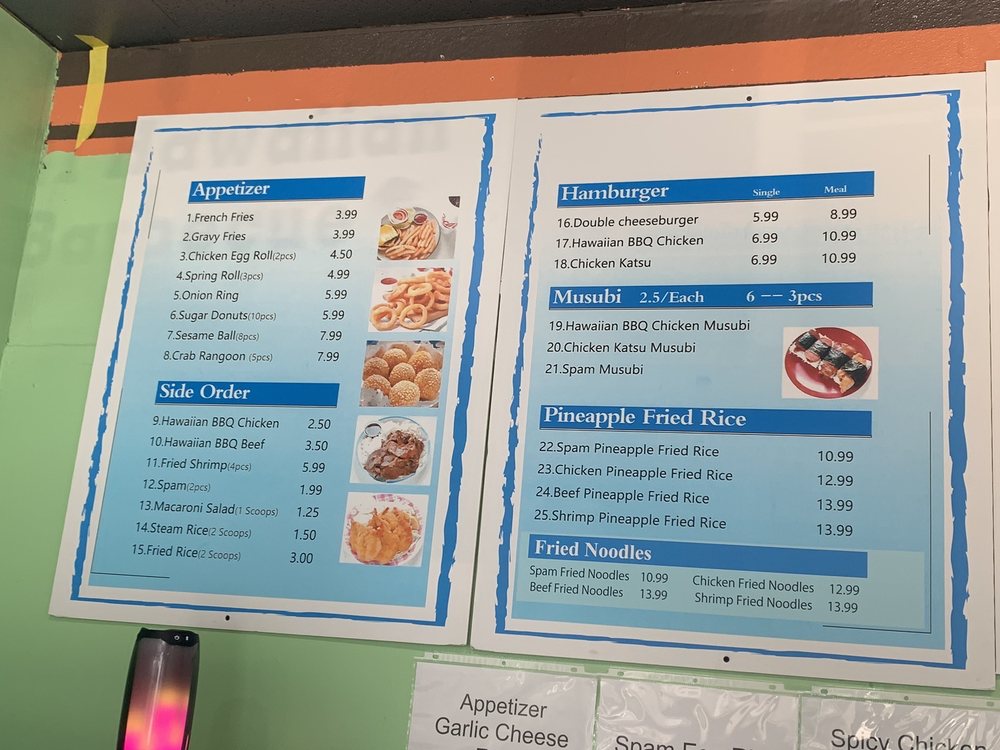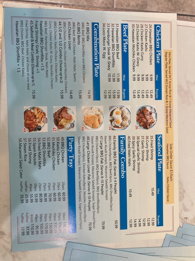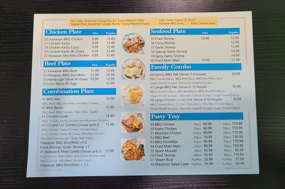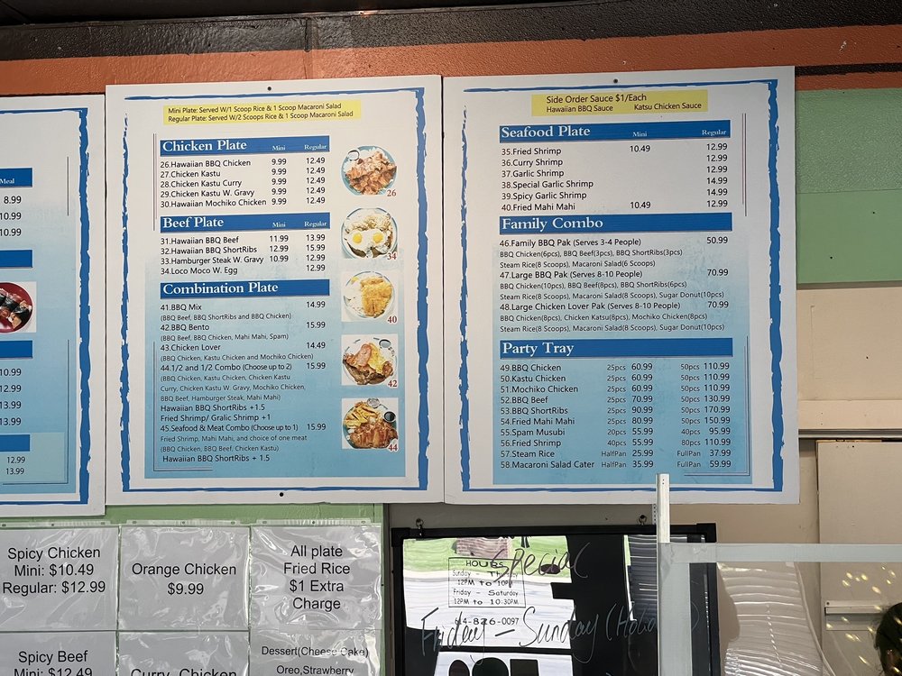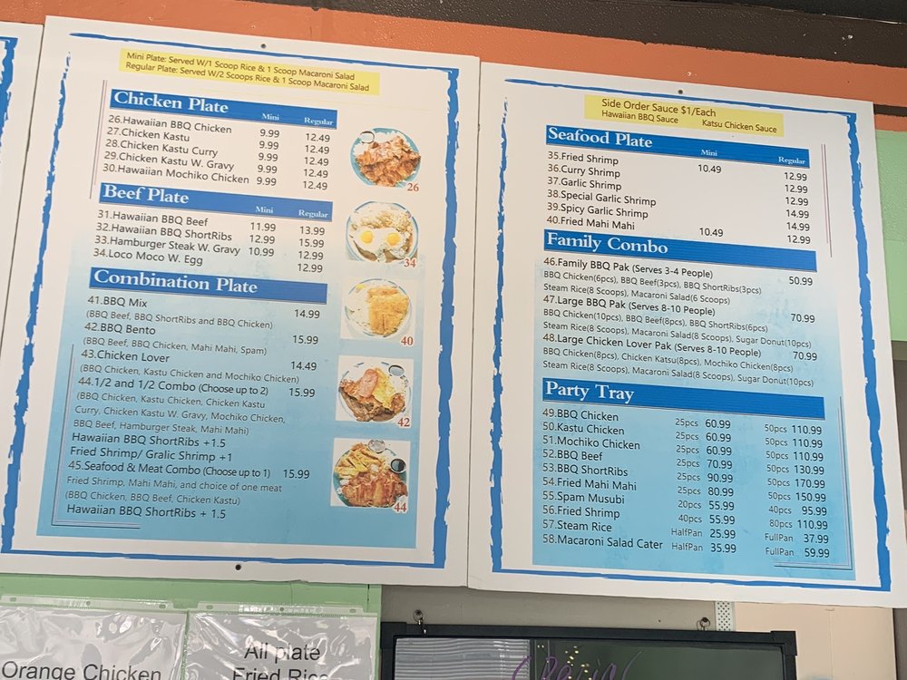 BBQ beef, BBQ chicken, mahi mahi, spam.
